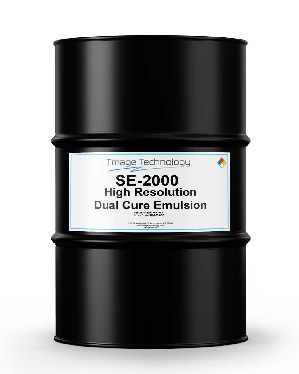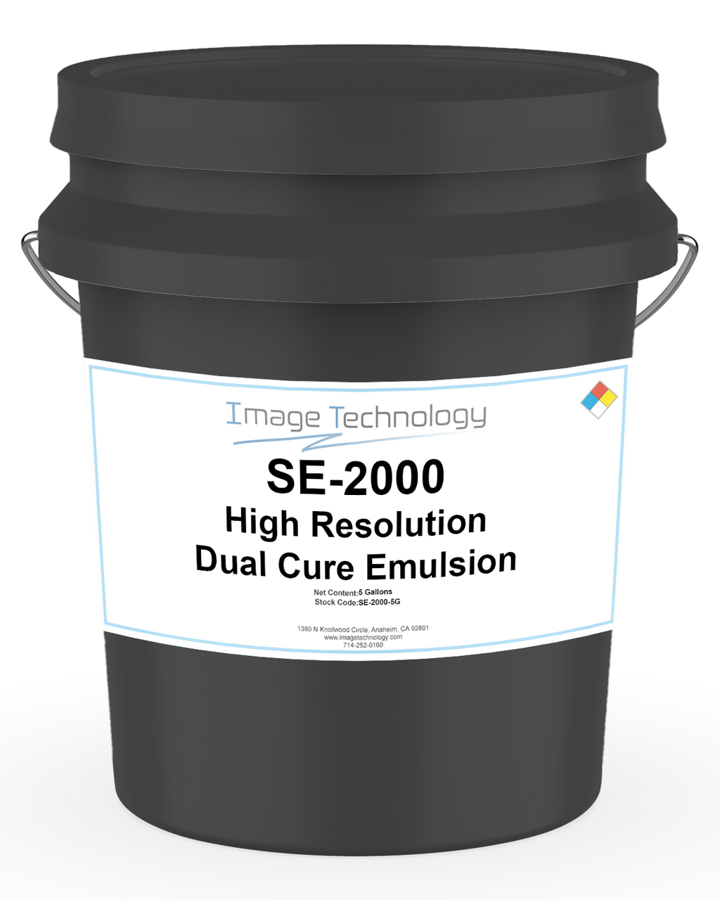 SE-2000 High Resolution Dual Cure Emulsion is a high performance industrial, graphics, and textile emulsion for printing. Designed to be flexible and excellent for half-tone, fine line printing, and graphic displays.